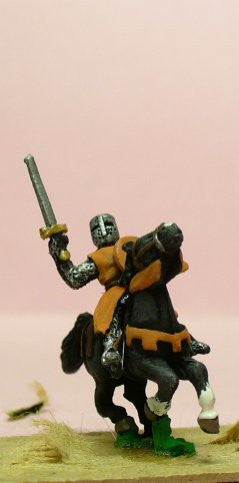 Mounted Knights, 1200-1250AD, with Kite Shield & Mace, Axe or Sword, in Barrel Helms, on Unarmoured Horse MID9a